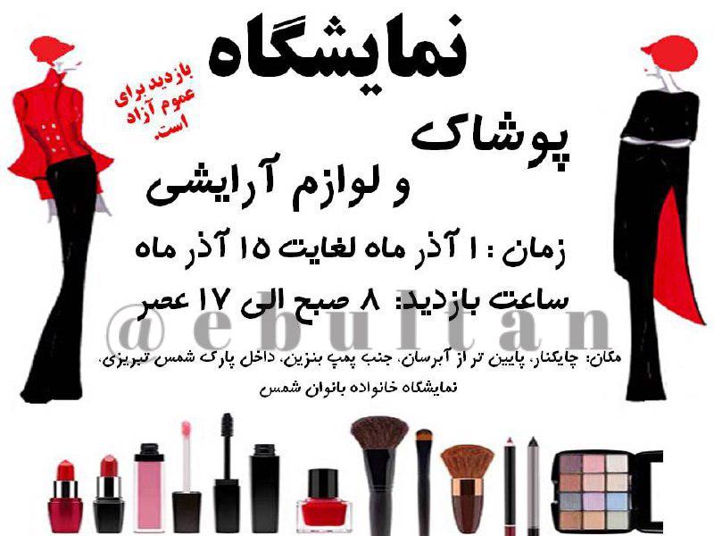 نمایشگاه پوشاک و لوازم آرایشی/نمایشگاه پوشاک و لوازم آرایشی ( دسترنج بانوان کار آفرین ) از ۱ آذر ماه سال جاری تا ۱۵ آذر۹۵( غیر از روزهای تعطیل و جمعه) برگزار میشود.