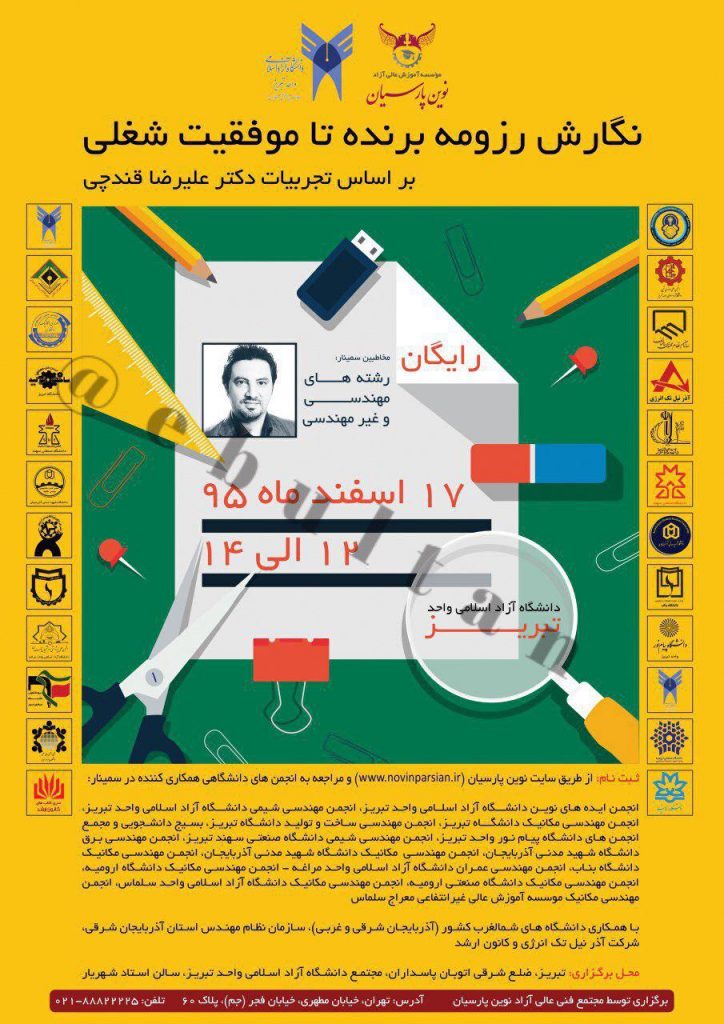 سمینار توسعه فردی با توجه به نیازهاى امروزه در خصوص توانایی های مدیریتی و راهبری برای جوانان و بالأخص دانشجویانى که قصد ورود به بازار کار را دارند،توانایى مدیریت حائز اهمیت زیادى است.لذا آیسک تبریز قصد بر این دارد که سمیناری در این رابطه برگزار نماید.سمینار توسط برگزارکنندگانی از...